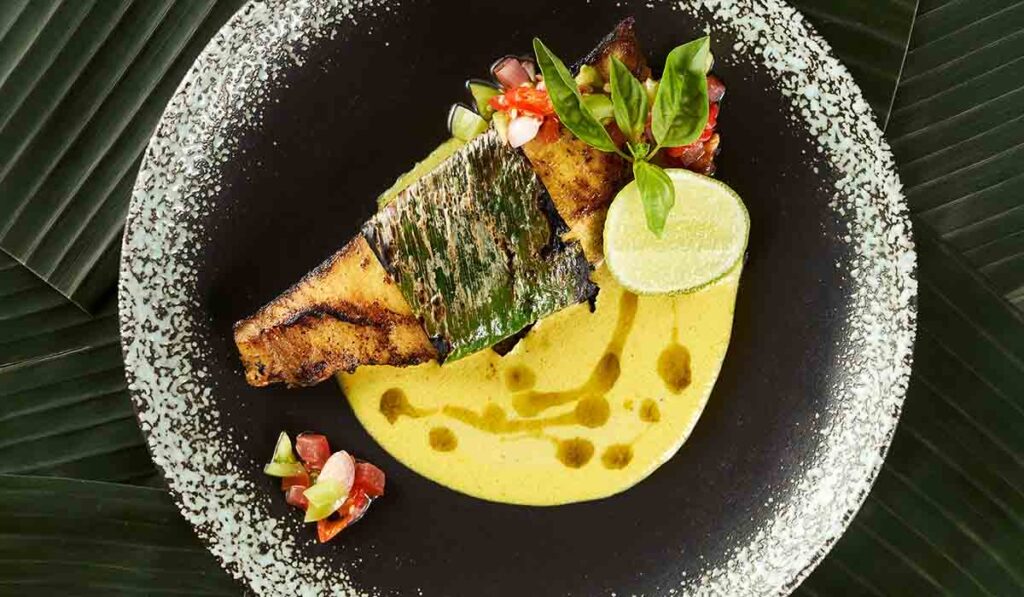 Ikan Bakar Kunyit Asap – cobia lokal berpadu mentega kunyit dan sambal dabu-dabu.