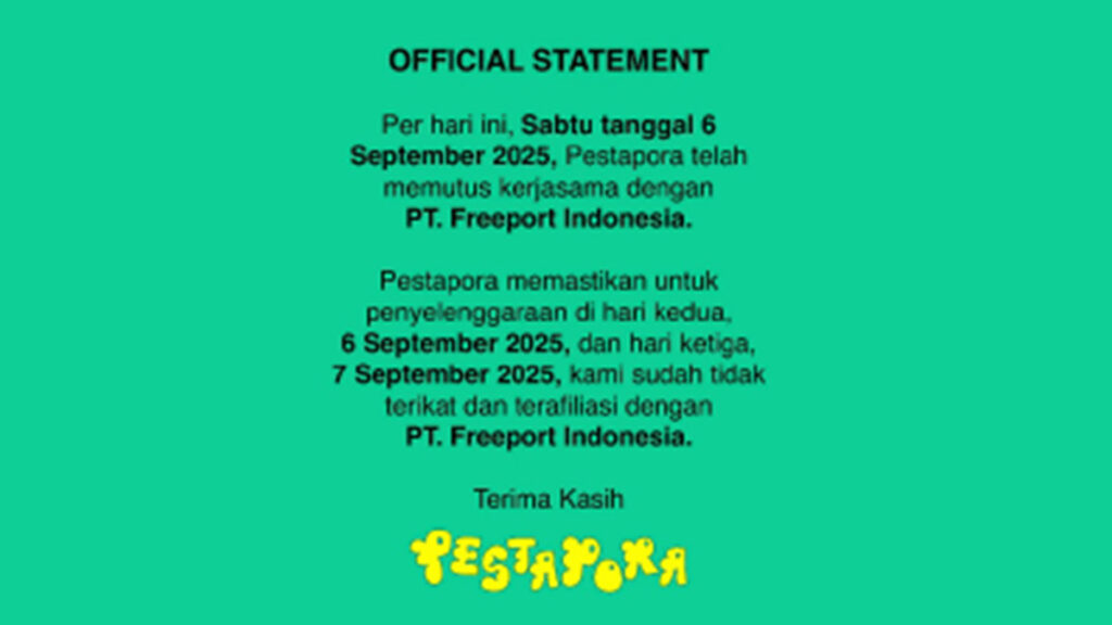 Di tengah tekanan publik yang semakin besar di ruang digital, penyelenggara akhirnya memutus kerja sama dengan sponsor tersebut. Keputusan ini diumumkan melalui Instagram resmi Pestapora, disertai permintaan maaf dan pengakuan adanya kekeliruan dalam proses kerja sama.